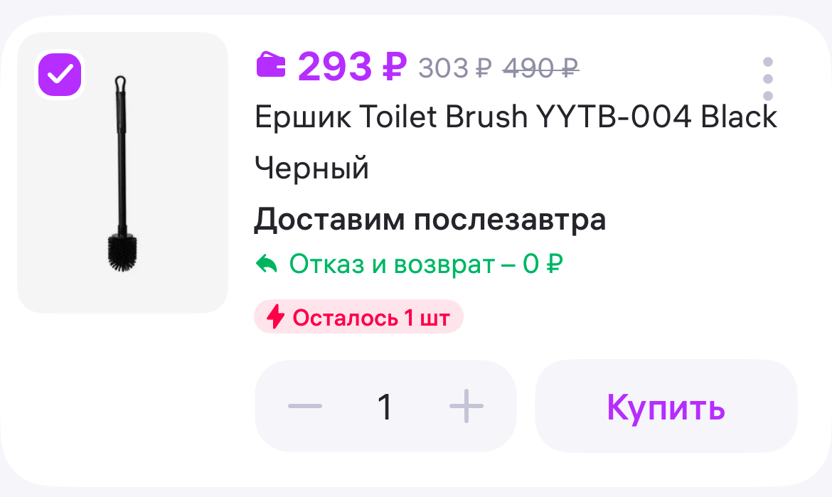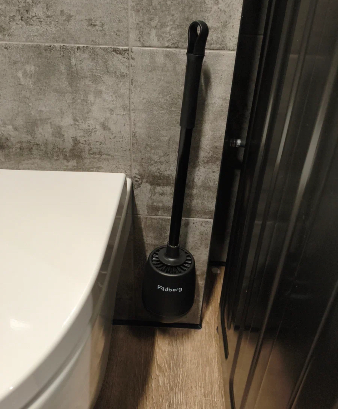В комплекте идёт пластиковый держатель с противокапельной системой. Разбирается на части, поддон можно вынуть и промыть. Это удобно, но есть нюанс: если ставить ёршик неаккуратно, капли всё равно могут попасть на внешнюю сторону. Зато сам поддон плоский и не занимает много места.