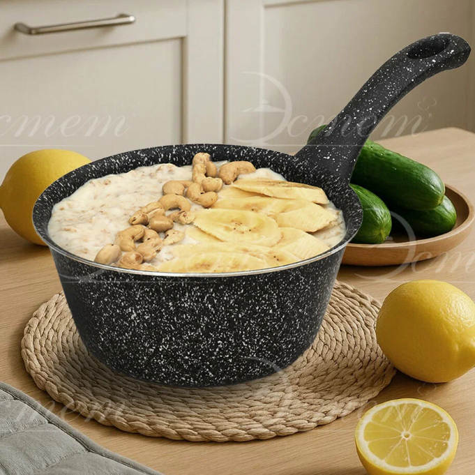 У него небольшой объём, 1.3 литра, так что он идеально подходит для того, чтобы сварить пару порций каши, разогреть соус или приготовить яичницу. Он сделан из алюминия с антипригарным покрытием внутри, поэтому еда в нём не пригорает и готовится достаточно равномерно.