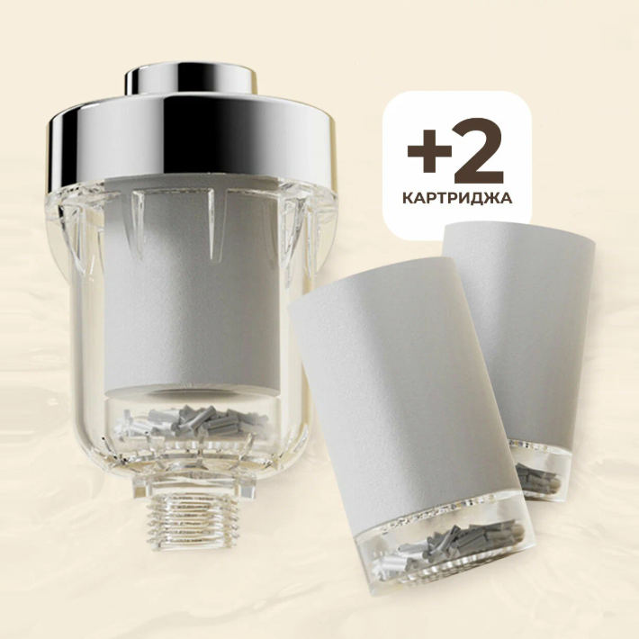 Неплохой фильтр для душа, который не бьет по карману, зато воду чистит на совесть. Выдает 500 литров в минуту, а ресурса кассеты хватит на 40000 литров. Убирает ржавчину, песок и главное хлор. Корпус прозрачный, так что видно когда пора менять картридж, которых в комплекте 3 штуки.