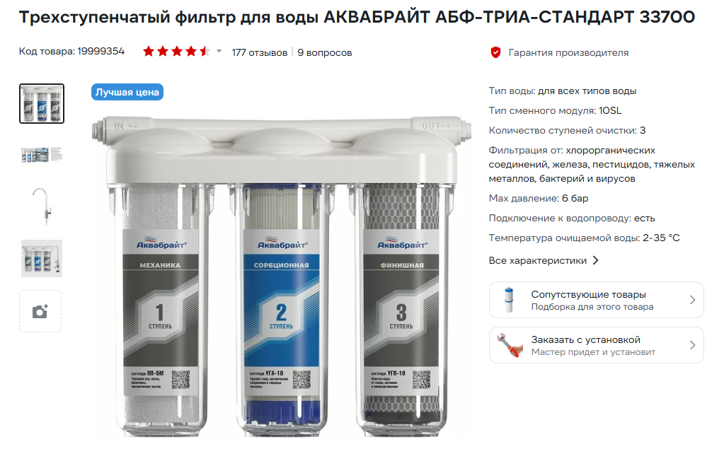 Трёхступенчатый фильтр для очистки холодной водопроводной воды, который устанавливается под мойку и комплектуется отдельным краном. В магазине хорошая цена, обычно 2500-2700р стоимость