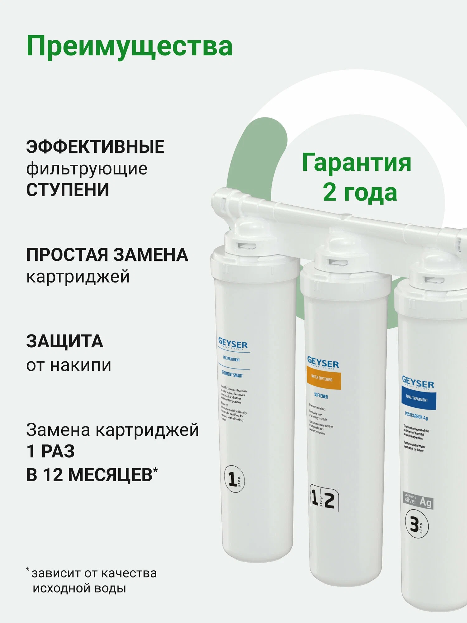 3 ступени очистки: Механика Смарт, Экотар Смарт, Посткарбон Ag Смарт. Очищают воду от механических частиц, хлора, тяжелых металлов, железа, солей жёсткости.