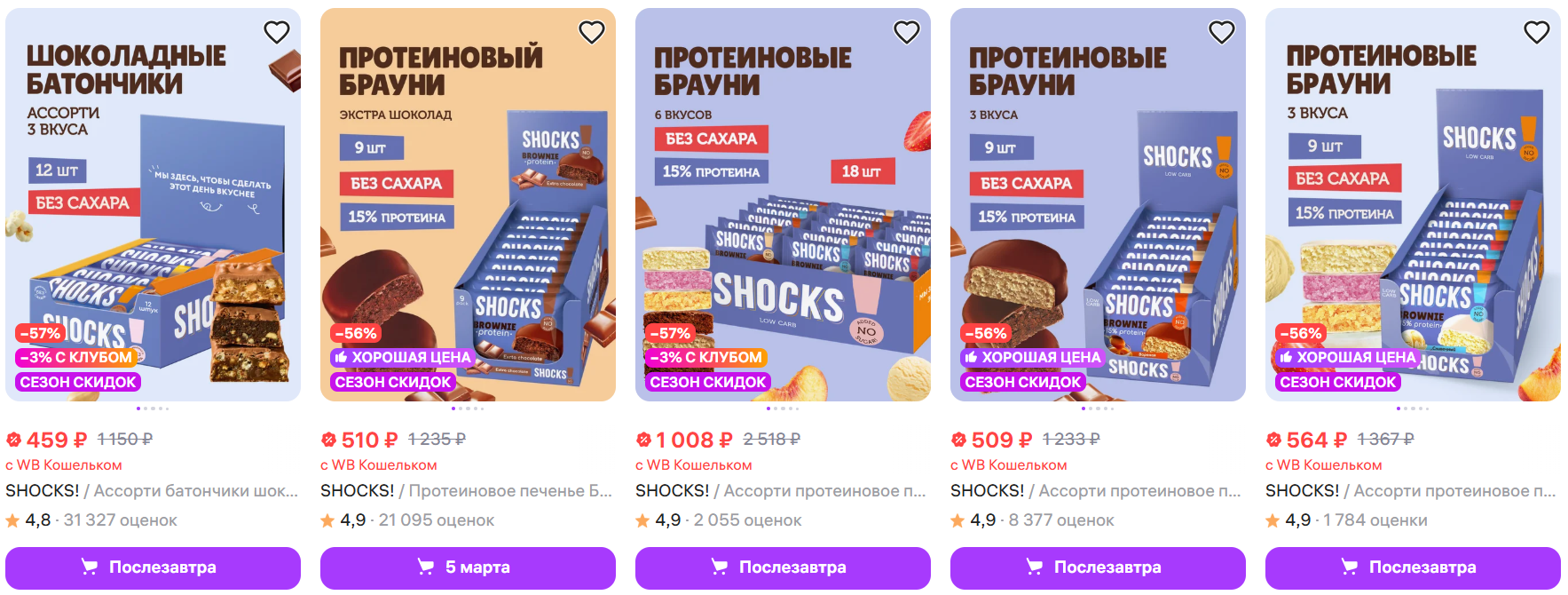 По хорошим ценам на Wildberries сейчас можно взять полезные сладости FitnesSHOCK (с учётом WB кошелька). Подборка для тех, кто следит за питанием, но не готов отказываться от десертов.