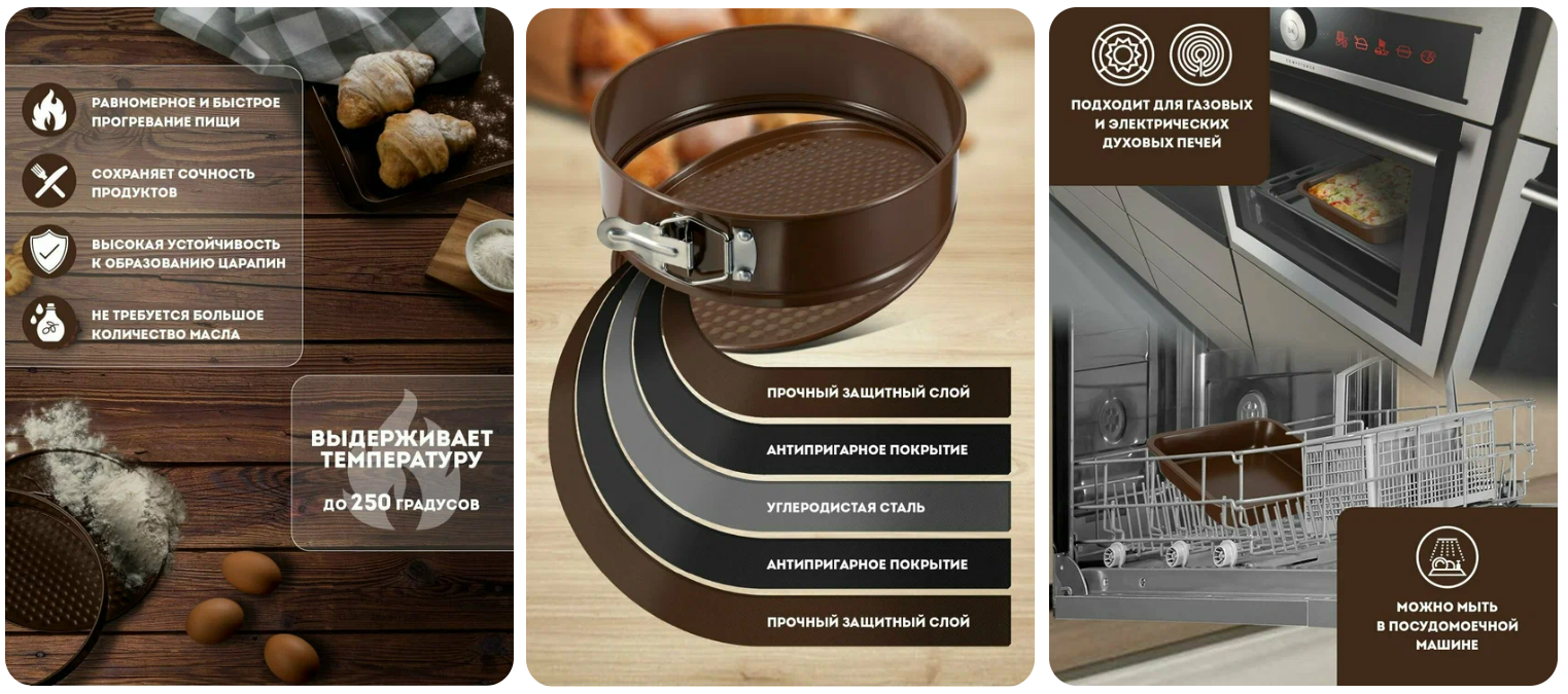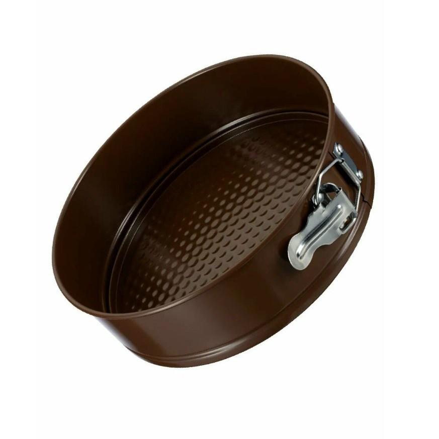 Круглая, с антипригарным покрытием. Сделана из углеродистой стали толщиной 0.4 мм, выдерживает температуру до 250°C. Удобно для бисквитов, запеканок или чизкейков - боковое кольцо снимается, ничего не нужно вытряхивать. Можно мыть в посудомойке.
