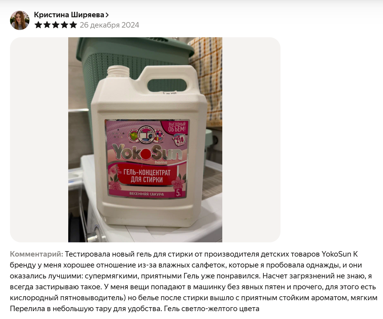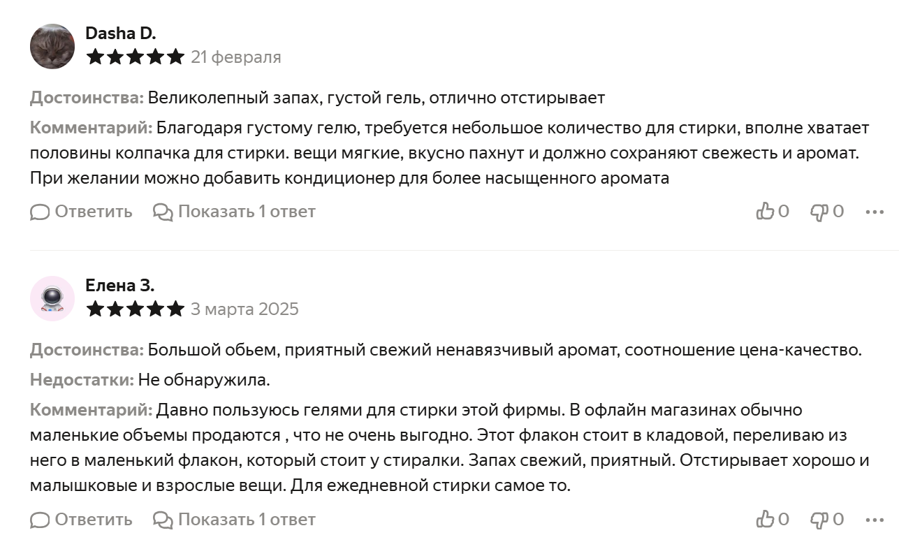 Отличный гель для стирки! У меня двое деток, вечно переживаю чтоб ничего не вызвало аллергию. А этот с первых дней можно, гипоаллергенный, без фосфатов и красителей. Пятна от каш и соков отстирывает отлично, даже в холодной воде. Белое не желтеет, цветное не линяет. Запах легкий, крокус, очень приятный. Крышечка мерная, один колпачок на стирку, очень экономично. Бутылки 2.1 л надолго хватает. Для машинки и для ручной стирки подходит. В общем всем советую, особенно мамочкам. И отзывов у него много. чуть не забыла, для скидки надо ввести промокод в корзине