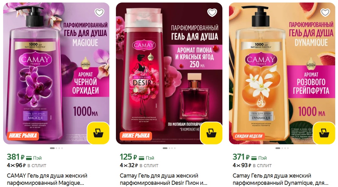 Женские парфюмированные гели для душа CAMAY с разнообразными ароматами и ухаживающими компонентами по низким ценам.