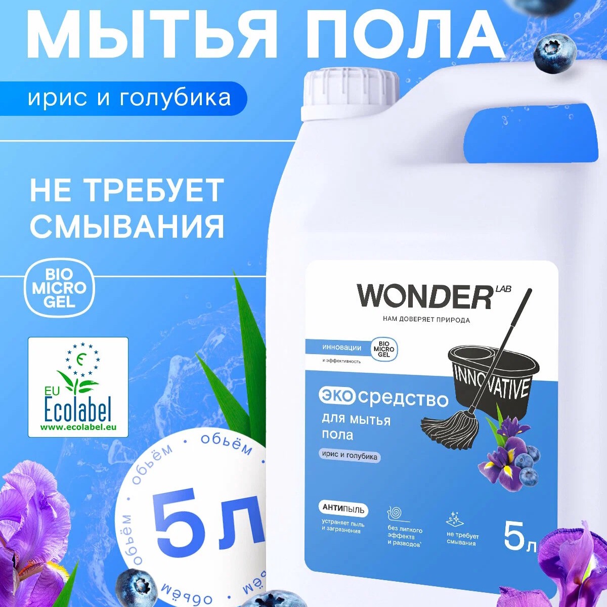 Гипоаллергенное средство для мытья полов Антипыль с ароматом "Ирис и голубика, WONDER LAB, 5 л