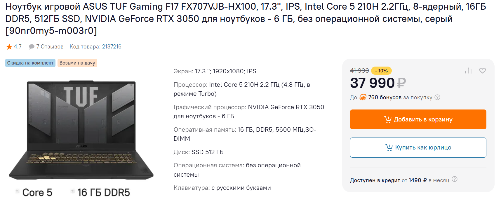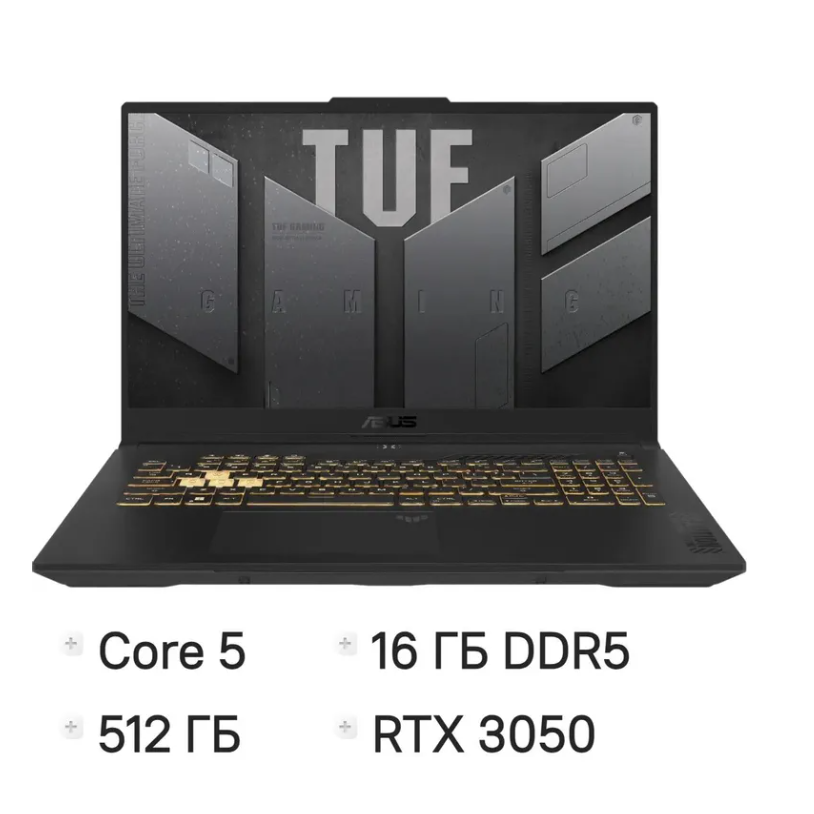 Цена в 3 раза дешевле! Большой игровой ноутбук с экраном 17.3". Процессор Intel Core 5, 16 ГБ оперативки и SSD на 512 ГБ. Видеокарта RTX 3050 с 6 ГБ — для современных игр и графики вполне хватает. Экран IPS, 1920×1080, частота обновления высокая, картинка плавная. Корпус зелёный, в стиле TUF, крепкий. Операционной системы нет - ставите ту, которая нравится. Такая цена в Курске - проверяй у себя! Спасибо за скидку нашему подписчику.