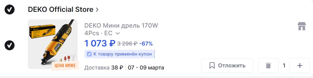 Купон под карточкой. Для мелкий задач годится Есть регулировка скорости