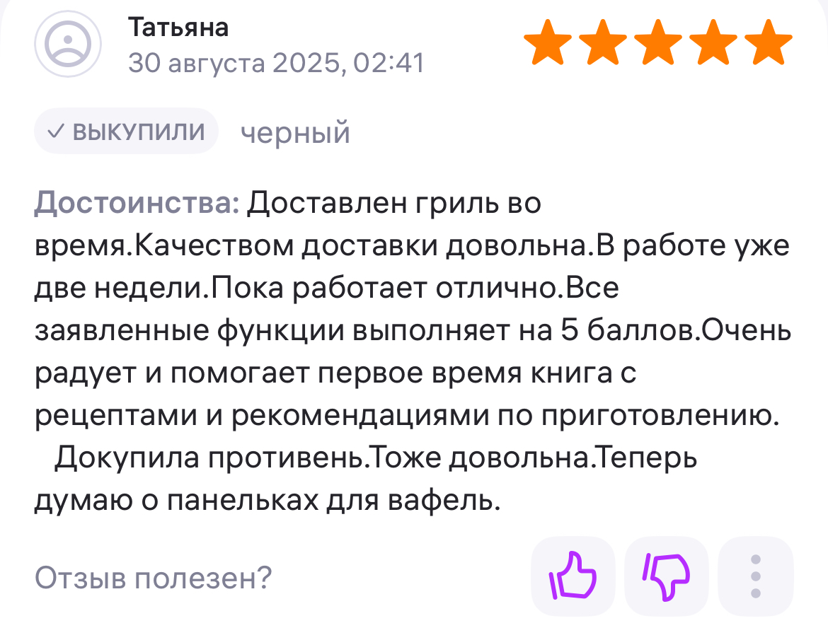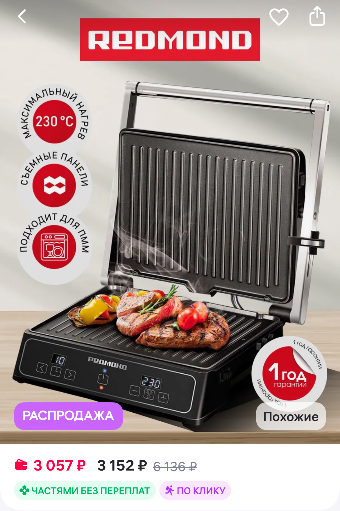 Сочетает в себе функции гриля, барбекю и духовки. Есть съемные панели с антипригарным покрытием. Быстрый равномерный нагрев + таймер