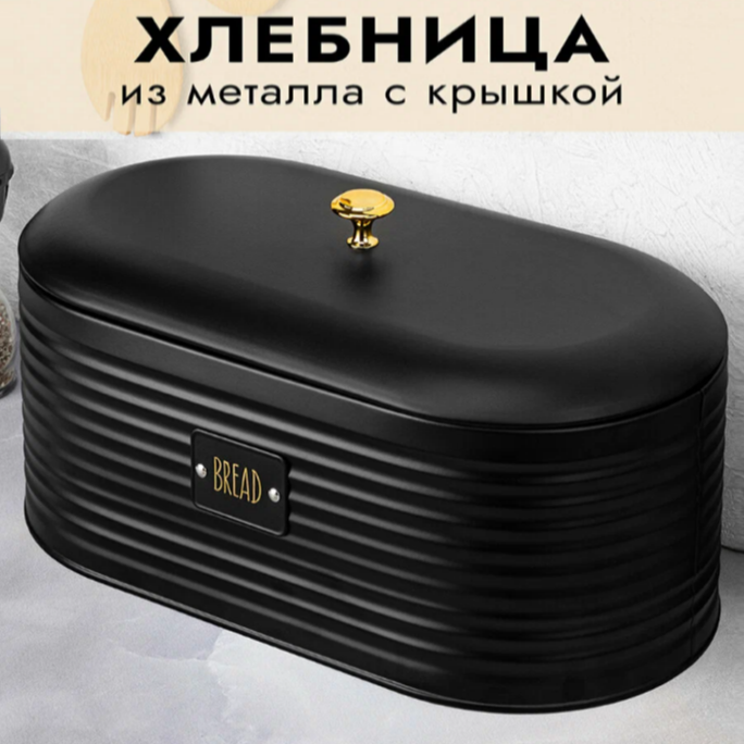 Выполнена из металла в черном цвете с лаконичной надписью "Bread", не впитывает запахи, не требует особого ухода, размеры 34х18х17.2 см. Защищает выпечку от высыхания, влаги и плесени.