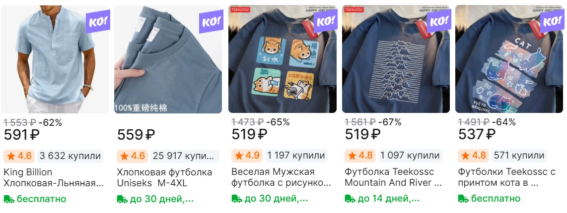 Огромный выбор футболок и поло на AliExpress, а самые выгодные цены при покупке через комбо-корзину. Минимальный заказ 1000₽, но действует ускоренная доставка.