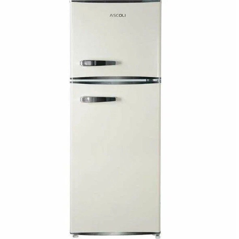 Как будто бы немного в рэтро-стиле. Необычно выглядит из-за ручек. Он двухкамерный, 120 литров (холод 84 л, морозилка 36 л). Морозит 2.5 кг в сутки. Полки стеклянные, режим «отпуск» есть. Дверь перевешивается, колесики для перемещения.