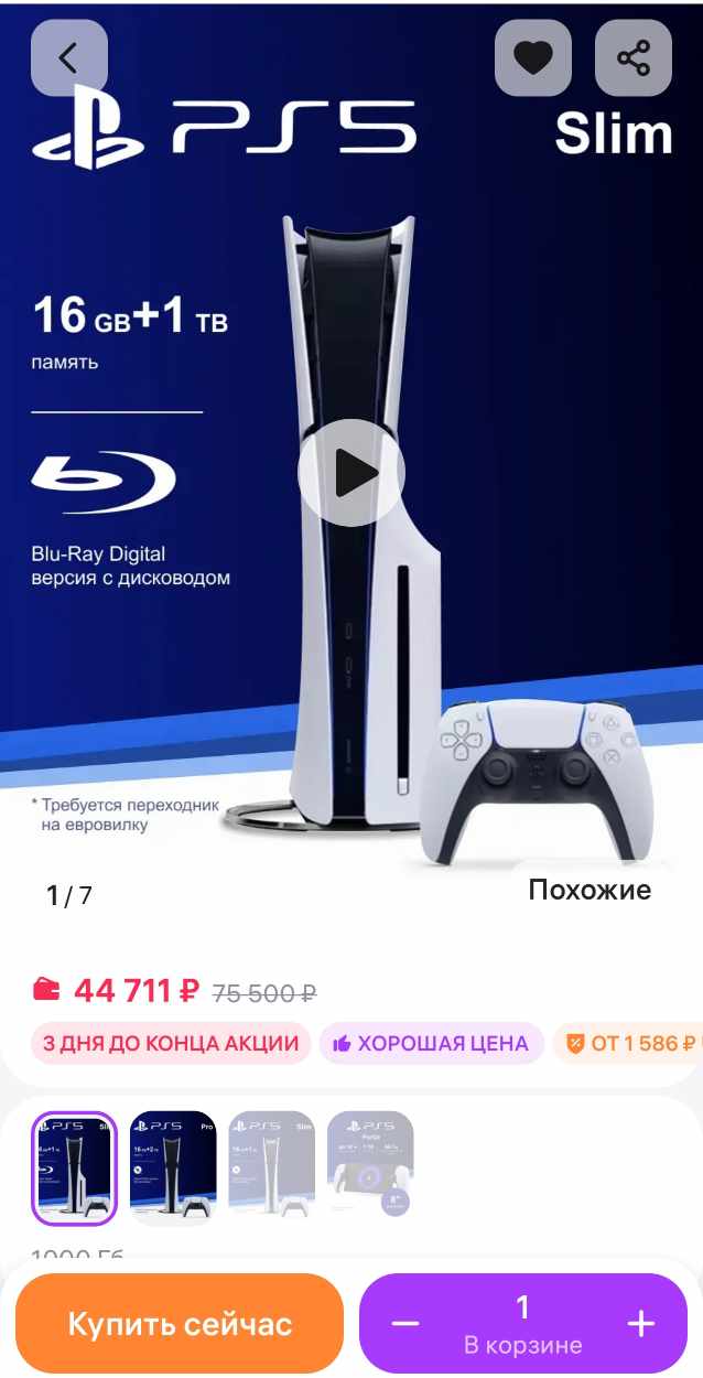 Топовая цена с доставкой завтра. Продавец сам WB. Классическая ПС5 с 1 ТБ. Написано нужен переходник, но в отзывах пишут, что не нужен и приходит европейка. В общем кто планировал, берите