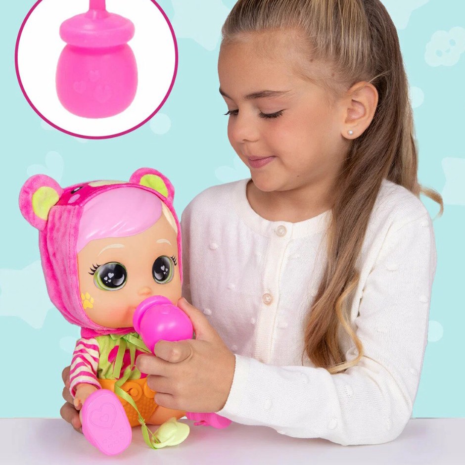 Настоящий друг для малыша. Она умеет плакать настоящими слезами, если забрать у неё пустышку, и тут же успокаивается, когда её обнимут или вернут соску. С ней здорово играть в дочки-матери: двигает ручками и ножками, а ещё у неё есть полный набор одежды и аксессуаров — капюшон с мишкой, подгузник, бутылочка и ботиночки. Работает от 2 батареек ААА (первые уже в коробке).