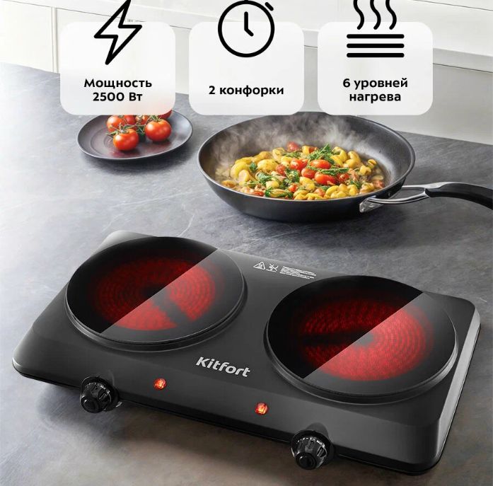 Стеклокерамическая поверхность, мощность 2500 Вт, 6 уровней нагрева. Механическое управление поворотными переключателями, есть индикатор работы.