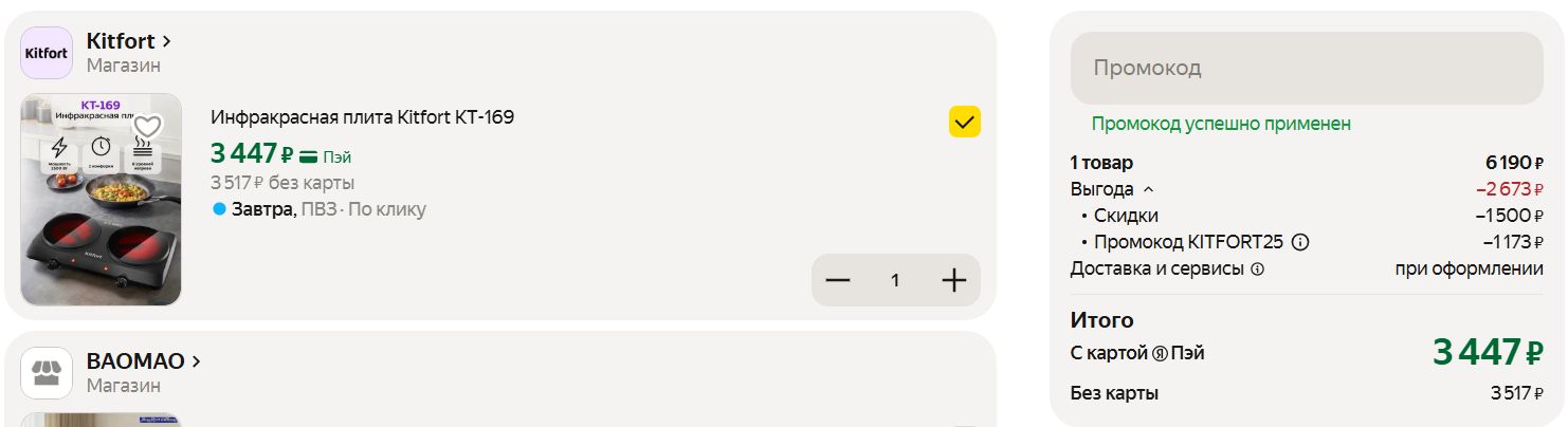 Промокод KITFORT25 активируется в корзине.