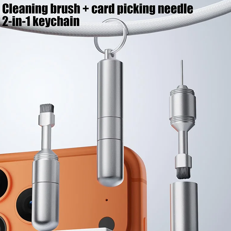 Универсальный набор 2 в 1: игла + щётка. Им можно вытащить лоток для SIM-карты, нажать кнопку сброса, почистить динамики или разъёмы наушников. Выполнен из алюминиевого сплава - прочный и лёгкий. Хорошая альтернатива заводским скрепкам, которые всегда теряются.