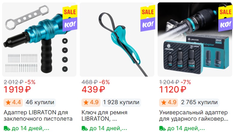 Через комбо-корзину на Алишке сейчас можно выгодно забрать инструменты и оснастку от бренда LIBRATON! Минимальный заказ - 1000₽, так что набирай сразу несколько позиций, в наших магазинах ценник х2.