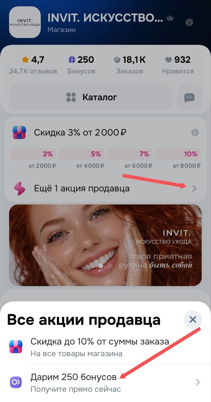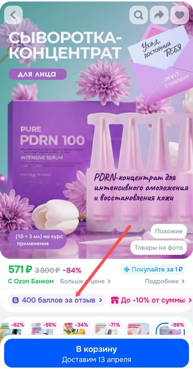 Ещё у продавца можно взять 250 бонусов, списать при оформлении до 25%. У меня сыворотка по цене 571 - 25% = 428₽ к оплате + вернут 400 баллами за отзыв.