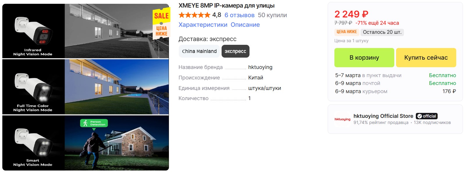 Привет. На Али сейчас уличная IP-камера XMEYE с 8 МП за 2249₽, доставка быстрая. Объектив 2,8 мм, поддержка ONVIF 2.4. Питание PoE (один кабель на всё), кодек H.265 экономит место. Встроенный микрофон, детекция движения с уведомлениями, можно задать область маски. Защита IP66, ИК-подсветка до 30 метров.