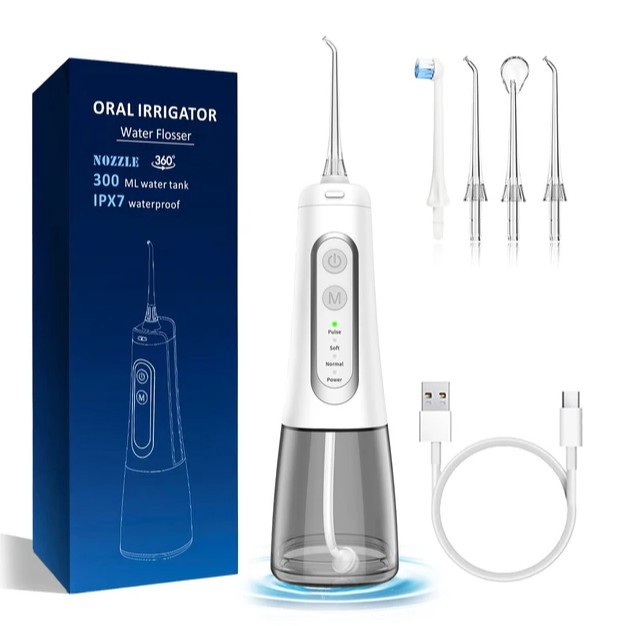 Работает от аккума 2000 мАч, водонепроницаемость IPX7, 4 режима: импульсный, щадящий, естественный, сильный, сопло вращается на 360°. Резервуар на 300 мл, давление 30-120 PSI.