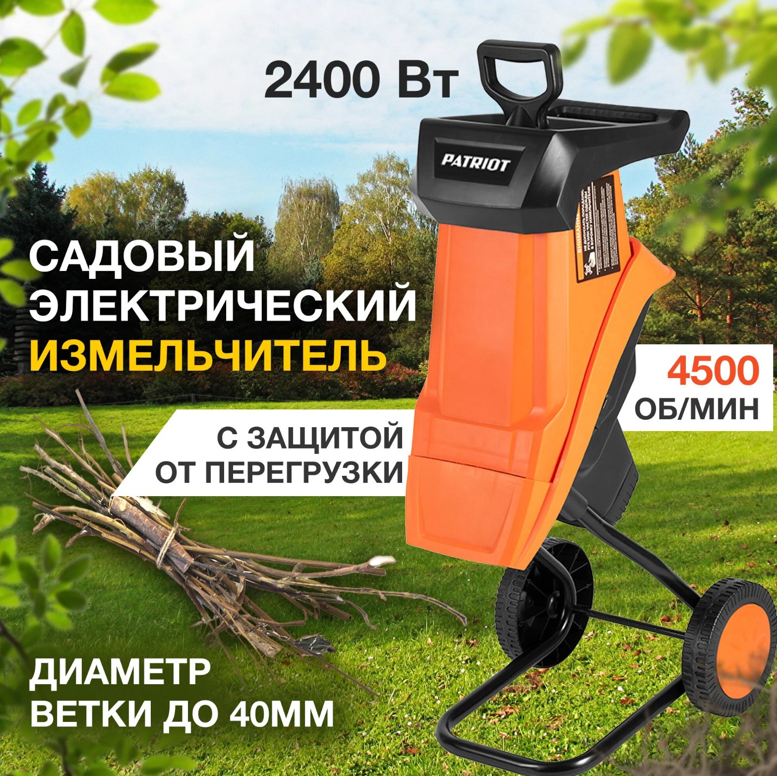 Электрический садовый измельчитель мощностью 2,4 кВт и скоростью вращения 4500 об/мин перерабатывает ветки диаметром до 40 мм в мелкую мульчу, пригодную для декоративных целей или утепления растений.