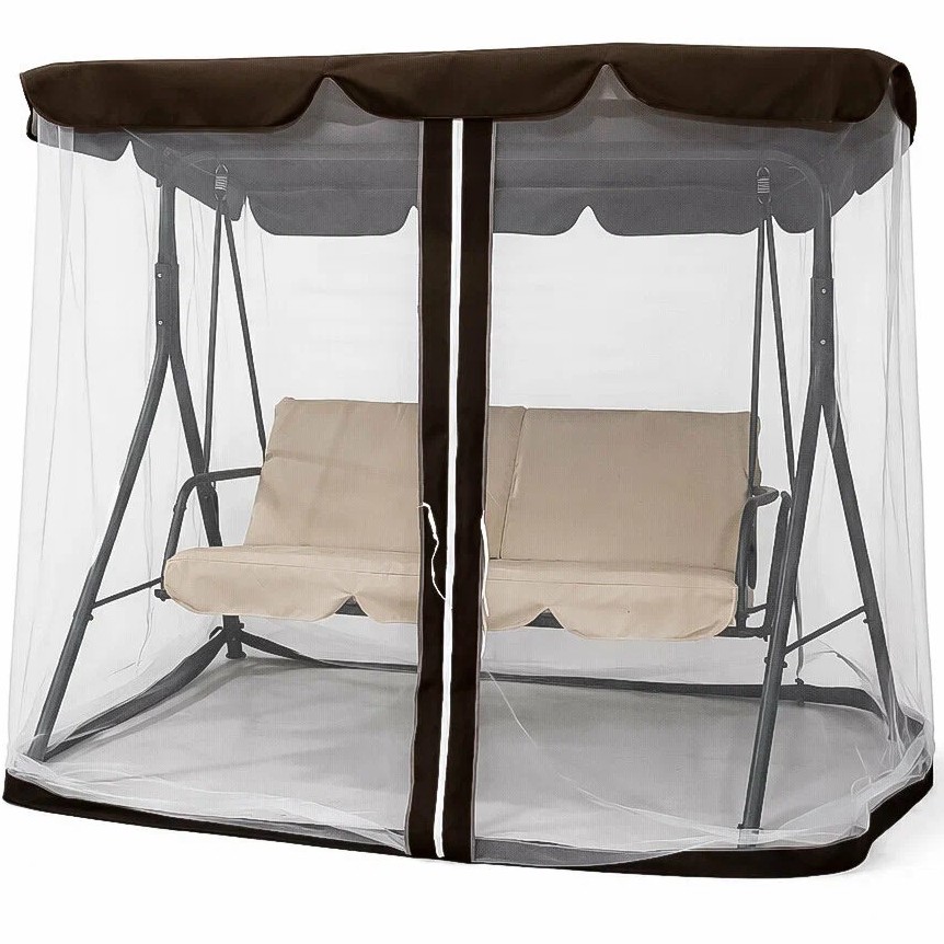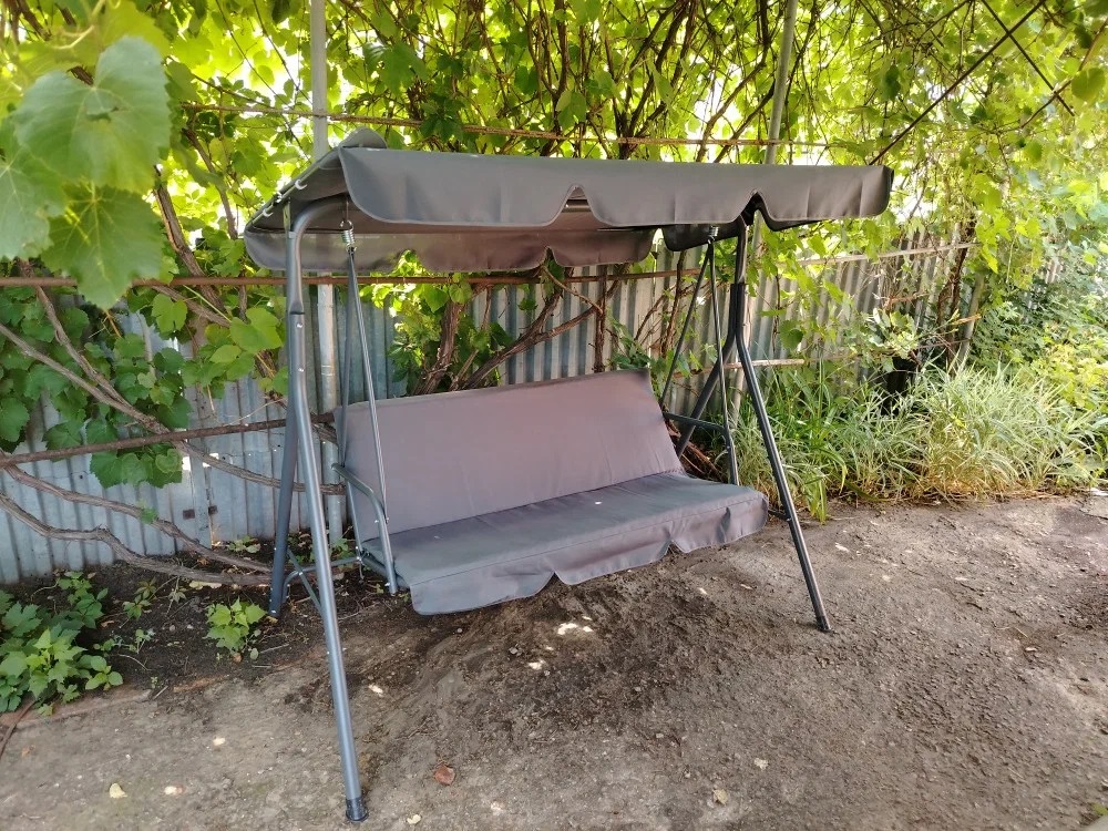 Каркас усиленный из труб разного диаметра (до 38 мм). Выдерживает до 210 кг - трое взрослых точно влезут. Порошковая покраска, не боится дождя и снега. Сиденья из Oxford 600D - плотная ткань, как на тентах и рюкзаках. Тент из плотного полиэстера даёт тень даже в жару + москитная сетка в комплекте.