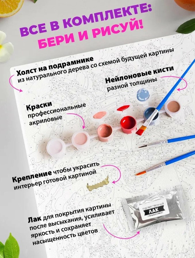 В комплекте к каждой картине: холст 40x50 см на прочном деревянном подрамнике (уже натянут), акриловые краски в пронумерованных баночках, 3 кисти разной толщины, крепление для стены, финишный лак для блеска и защиты, контрольный лист с нумерацией