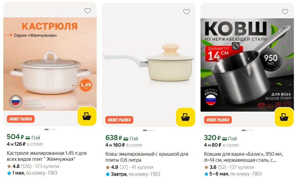 На Яндекс Маркет нашли кастрюли и ковши для приготовления продуктов по отличным ценам с бесплатной доставкой. Разные объёмы и материалы, хорошие отзывы.