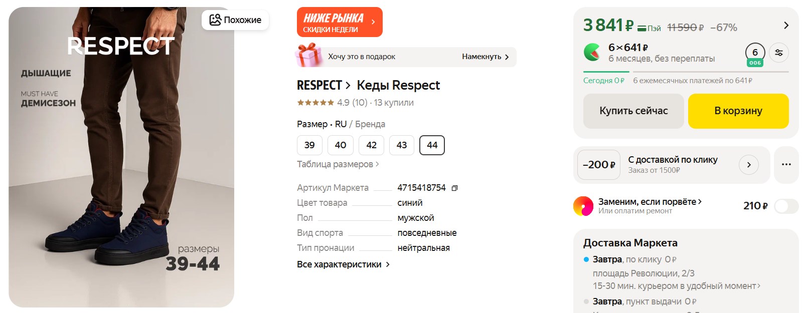 Привет. На Маркете кеды Respect за 3073₽ с промокодом RESPECTSHOES20. Верх комбинированный - текстиль + натуральная кожа, носок кожаный, прочный. Подошва из ТЭП, гибкая, с хорошим протектором. Застёжка комбинированная: шнурки и молния сбоку