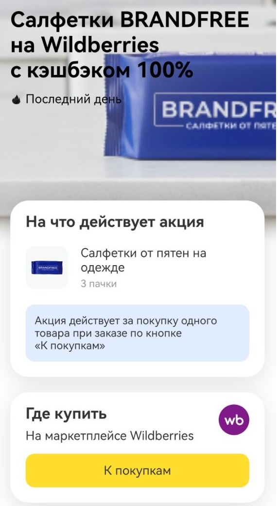 25 марта действует 100 кешбэк (максимум 500₽) на набор влажных салфеток от пятен на одежде и тканях, 24 шт.