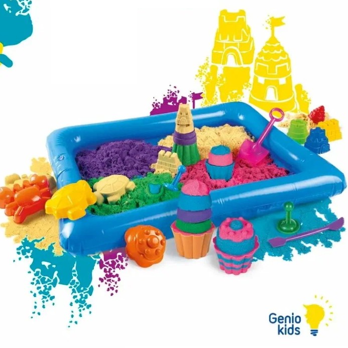 Песок классный: лепится, форму держит, но не застывает и не липнет к рукам. Пятен не оставляет. Песочница с высокими бортиками, песок не рассыпается по всему дому и это большой плюс.