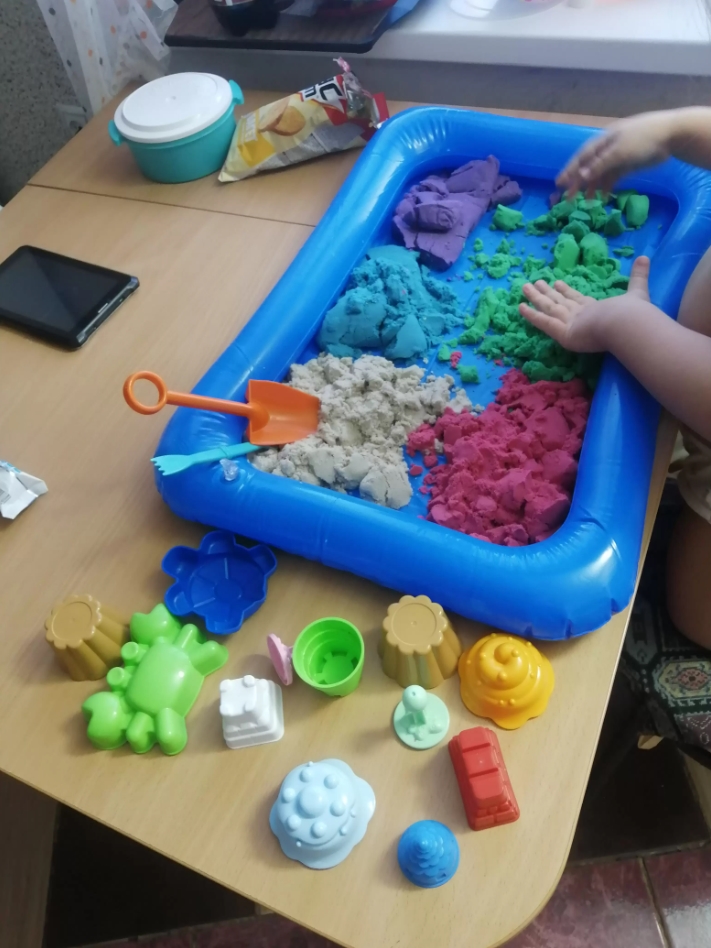 Заказала этот набор, цена отличная - 878₽ с промокодом. Всё в комплекте: песочница надувная 41х54 см, 2 кг песка (5 цветов), формочки (морские обитатели, кексики, замки), штампики, лопатка, стек.