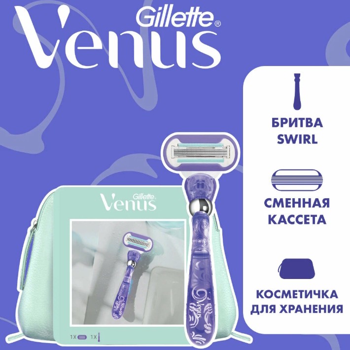 Первый - Gillette Venus Swirl с косметичкой за 847 руб по промокоду PODAROK20. Обычно такие наборы около 2000 руб стоят. Бритва с шариком Flexiball (та, что повторяет контуры), 5 лезвий, есть увлажняющая полоска с витамином Е.