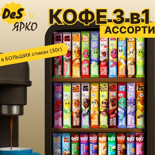В наборе 39 стиков, 37 вкусов по 30 г и 2 без сахара по 25 г. Там и классика, и всякие необычные: латте виноград, латте дюшес, какао клубничное, раф лавандовый - в общем, есть где поэкспериментировать.