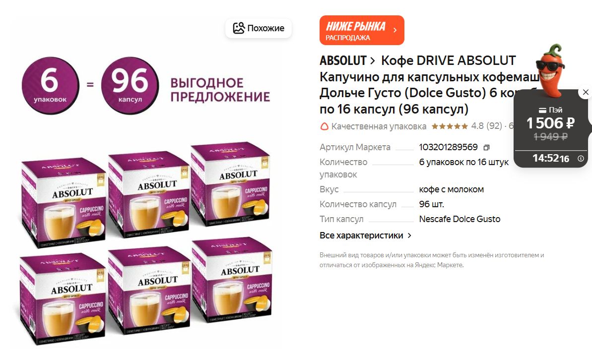 Сейчас 96 капсул за 1506₽ по акции с перчиком (оплата картой Пэй, у кого есть). Обычно такие наборы от 2000. Вкус нормальный, пена густая, не хуже оригинала. Уже не первый раз беру - рекомендую.