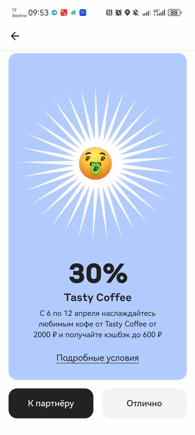 В альфа банке сейчас барабан на тести кофе, кешбэк можно выиграть до 100%. Но у меня выпало только 30%. Плюс ещё промокод на сайте можно взять.