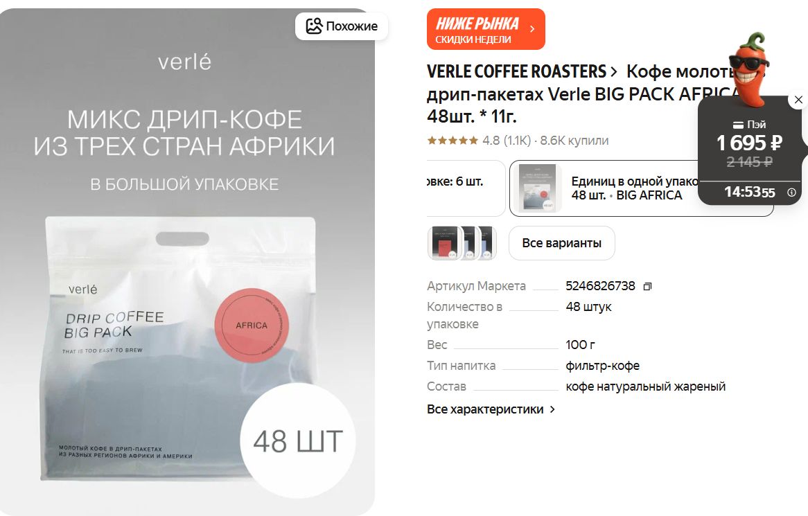 Дрип-пакеты - 48 штук за 1695₽ по акции с перчиком. По 35₽ за порцию. Обычно дороже. Часто беру - знаю.