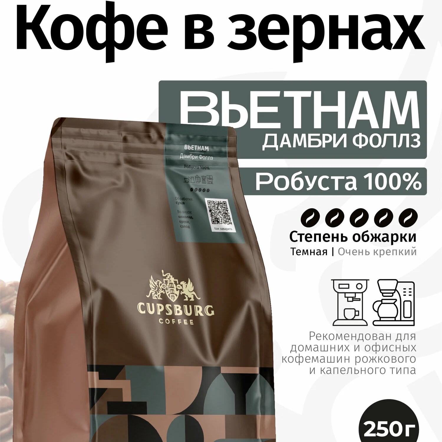 Подходит для приготовления в кофемашине, турке, гейзерной кофеварке.