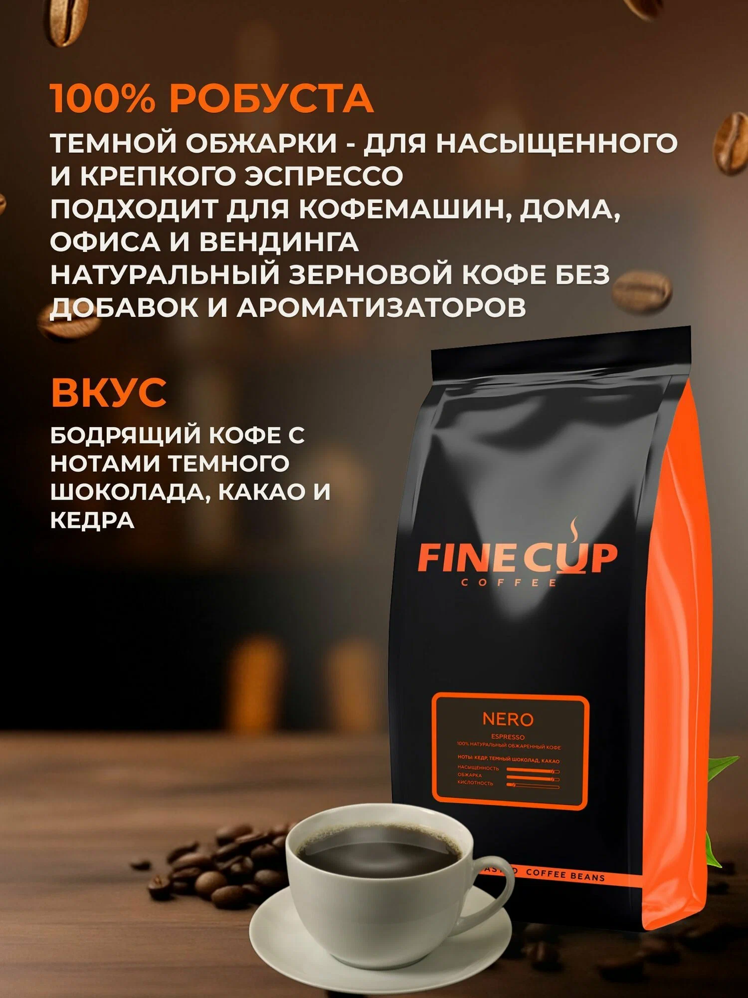 Натуральный зерновой кофе без добавок. В составе только робуста, обжарка тёмная - отсюда крепость, плотное тело и шоколадно-ореховые ноты. Во вкусе - тёмный шоколад, какао, кедр. Даёт густую пенку (крема) при варке эспрессо.