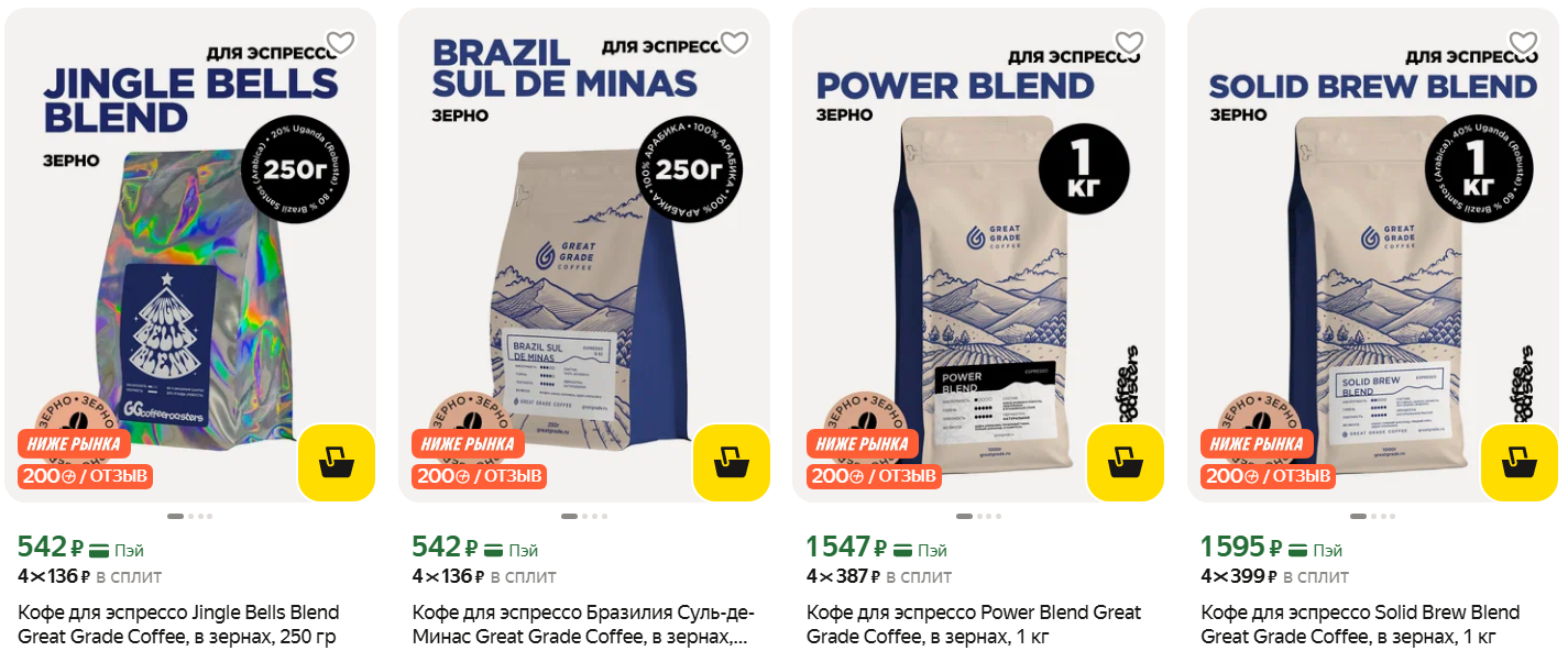 В каталоге огромный выбор блендов и объёмов. Можно выгодно под 200 баллов за отзыв забрать на пробу хорошую арабику, робусту или их смесь. Отзывы хорошие, отмечают свежаю обжарку и высокое качество зёрен.