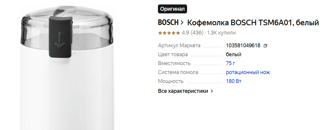 Если ты ищешь простую и надёжную кофемолку, то вот эта модель от Bosch - отличный вариатн. Она совсем небольшого размера (примерно 10х10х20 см), весит немного и поместится на любой полке. В неё вмещается до 75 грамм зёрен, что хватит на несколько кружек кофе за один раз.