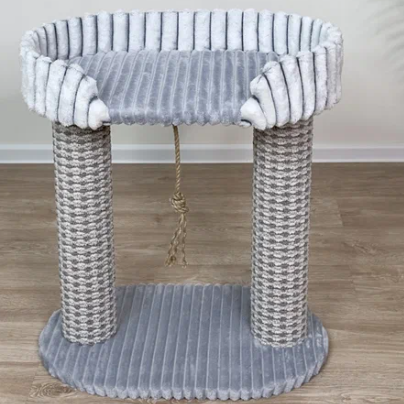 Удобный комплекс для кошек - два столбика, лежанка и джутовая верёвочка для игр. Сделан из прочного картона, обтянут ковролином и искусственным мехом. Размер 60×38×56 см, лёгкая сборка. Подойдёт для средних пород. Поможет уберечь мебель и стены от царапин. Хороший вариант, чтобы у питомца был свой уголок.