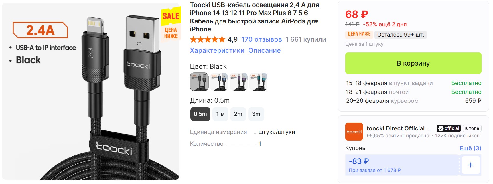 Заодно можно взять простой USB-кабель с силой тока до 2.4А от 68 рублей