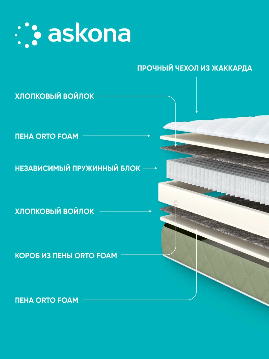 У фирмы гарантия только при использовании чехла, поэтому тут сразу готовый комплект. Сам матрас это классика Асконы средней жёсткости, высота 17 см, 550 независимых пружин на место, нагрузка до 110 кг. Наполнители анатомическая пена Orto Foam + хлопковый войлок. Самое важное усиленный короб по периметру - матрас не проседает по краям, даже если вы любите сидеть на кровати. Кстати, он двухсторонний - можно переворачивать, продлевая срок службы.