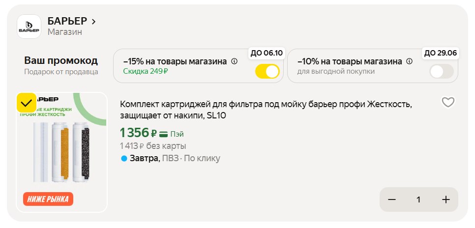 Нашла комплект картриджей для фильтра «Барьер Профи Жесткость SL10» - 1356₽ по промокоду D9T80WRC на Маркете. Обычно от 1700, так что экономия норм.