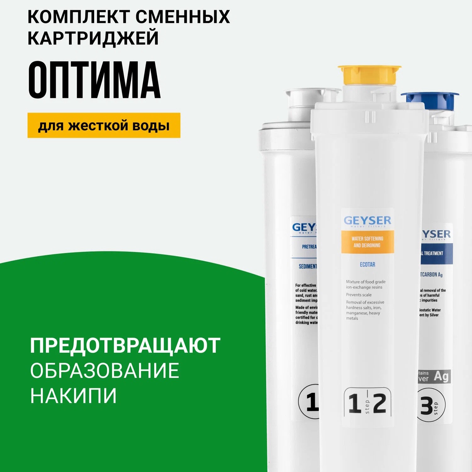 Комплект картриджей для воды, применяется для базовой очистки умеренно жёсткой воды, подходит для установки в фильтры Гейзер Смарт, Оптима, Фламинго. Умягчает жёсткую воду, удаляет железо, хлор и другие примеси. Ресурс до 12 месяцев в зависимости от качества воды.