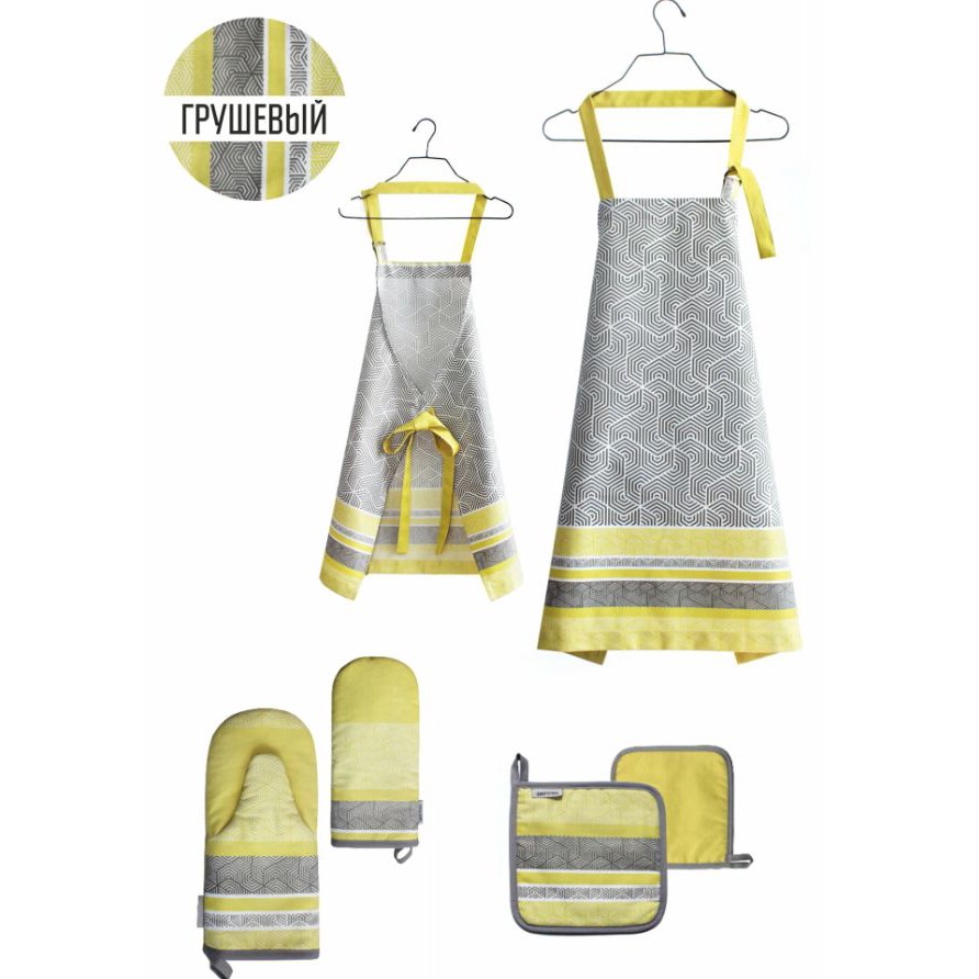 В комплекте фартук и два вида прихваток. Ткань смесовая, хлопок с полиэстером, рисунок симпатичный. Нравится, что размер на шее регулируется, выглядит как у профессиональных поваров фартук.