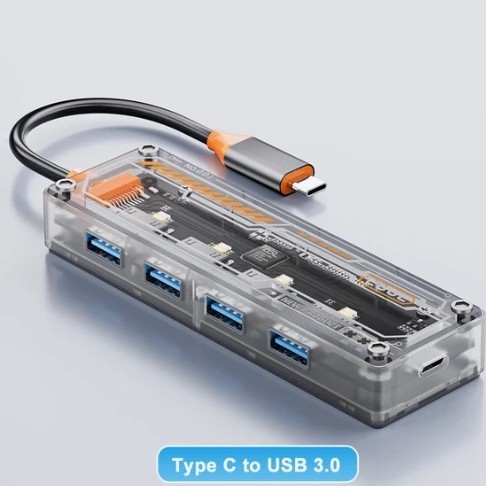 Можно выбрать версию с Type-C или обычным USB-штекером, под что тебе удобнее. У него прозрачный корпус, выглядит интересно. Порты: четыре USB 3.0 плюс один Type-C, скорость передачи до 500 мегабайт в секунду - для рабочих файлов или фильмов самое то.