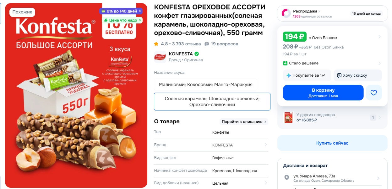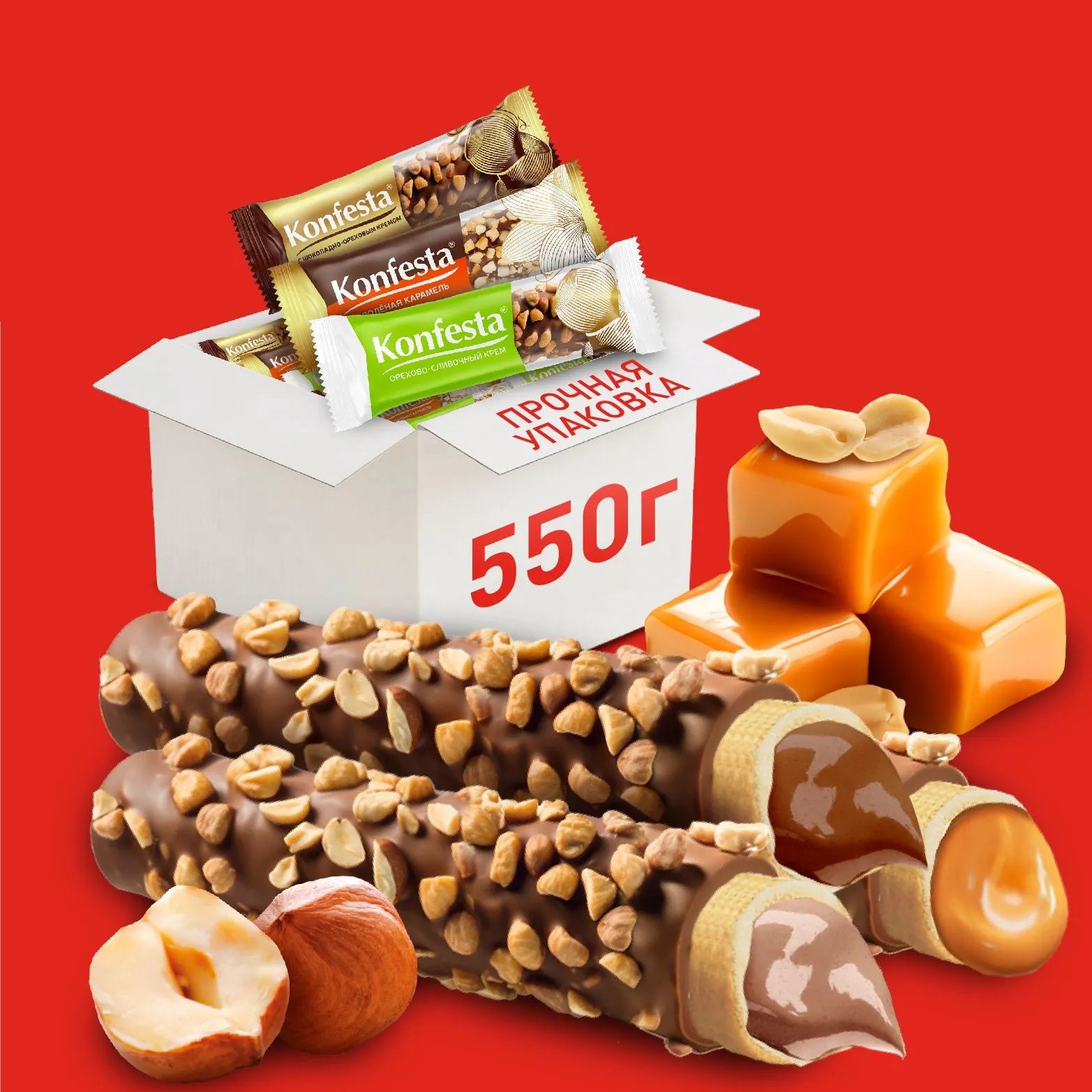 В комплекте соленая карамель, шоколадно-ореховая, орехово-сливочная. Общий вес 550 гр. Дешево для этих конфет. Отзывы нормальные, но не пробовали такие вкусы